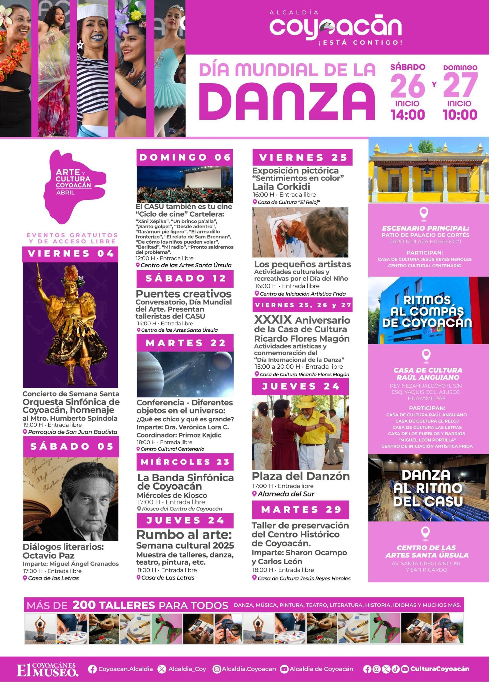 Entre los imperdibles del mes, destaca el Día Mundial de la Danza, que se celebrará en grande el sábado 26 y domingo 27 de abril, con funciones desde las 14:00 y 10:00 horas respectivamente. El Patio del Palacio de Cortés será el escenario principal, acompañado por presentaciones en casas de cultura y centros artísticos de la alcaldía.