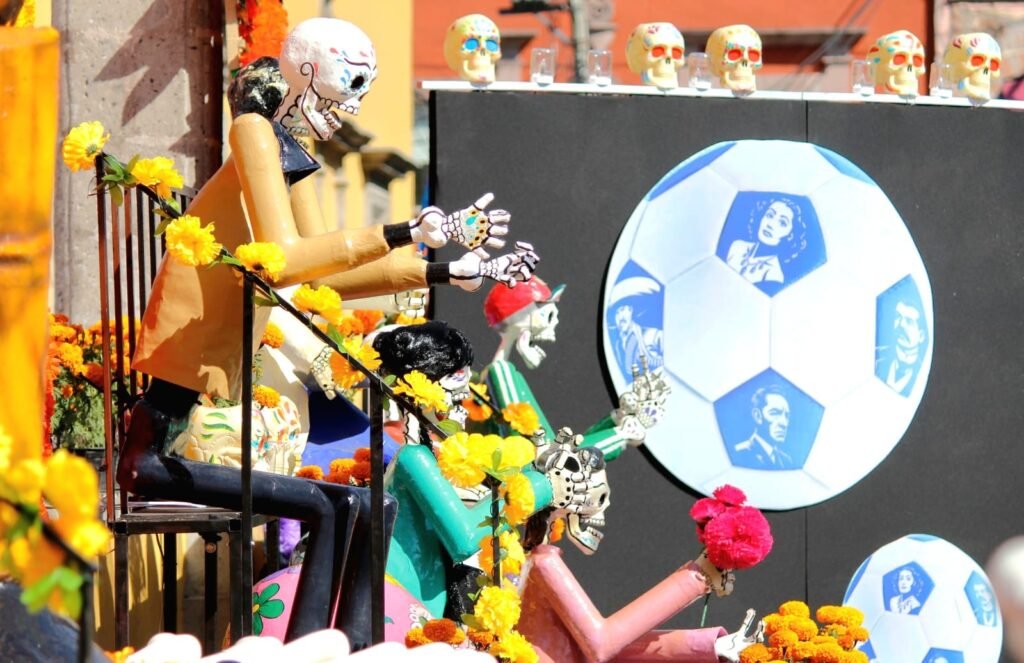 El recorrido invita a disfrutar de un “partido eterno” entre calacas futbolistas, porterías adornadas y un tapete multicolor que combina el arte popular con la pasión deportiva. Además, se incluyen los elementos tradicionales del altar: veladoras, incienso, pan de muerto y flores de cempasúchil.
