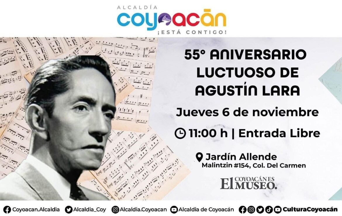 El romanticismo volverá a llenar el aire del Centro de Coyoacán este jueves 6 de noviembre, cuando la Alcaldía Coyoacán conmemore el 55° aniversario luctuoso de Agustín Lara, uno de los más grandes compositores de la música mexicana.