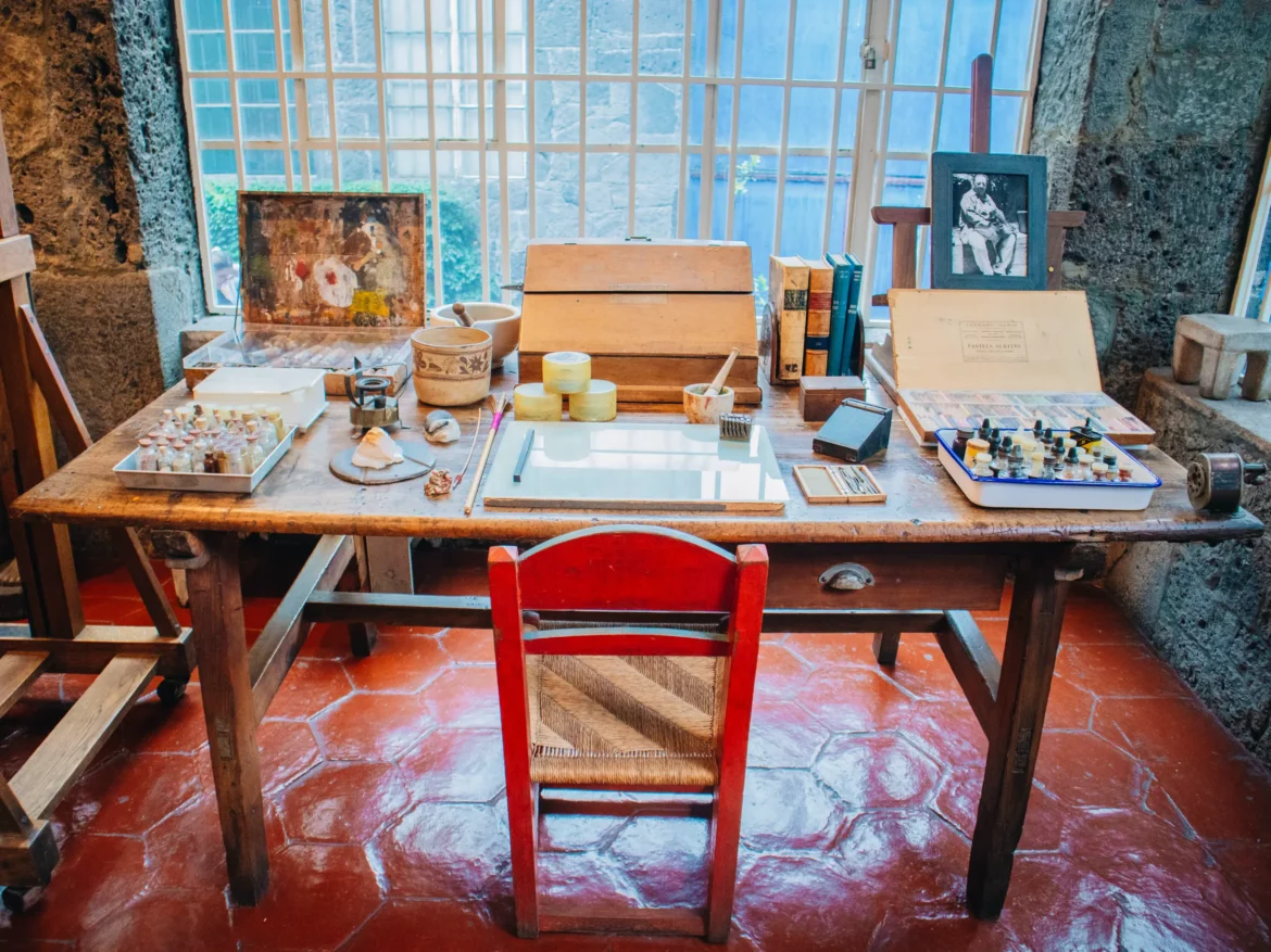 At first glance, the Casa Azul surprises with its facade of intense blue, a shade known as “bishop’s blue”, which stands out among the streets of Coyoacán. But it is inside where Frida’s true essence unfolds. The rooms, now converted into exhibition halls, are filled with art, personal objects, photographs, and keepsakes that tell the story of Frida Kahlo and her husband Diego Rivera.