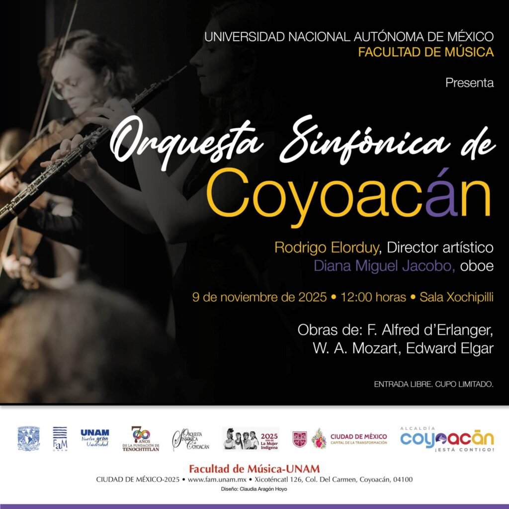 El arte y la música volverán a encontrarse en el corazón de Coyoacán este domingo 9 de noviembre de 2025, cuando la Orquesta Sinfónica de Coyoacán se presente en la Sala Xochipilli de la Facultad de Música de la UNAM, bajo la dirección artística de Rodrigo Elorduy y la participación especial de Diana Miguel Jacobo en el oboe.